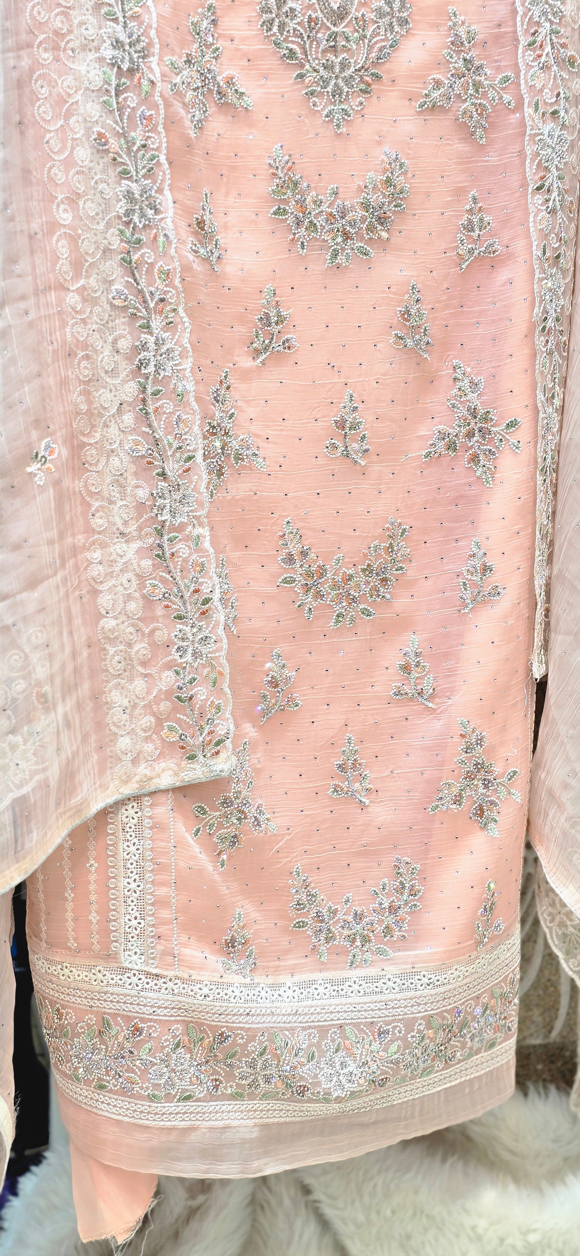 Experience elegance with this 3-piece exclusive unstitched set, featuring intricate heavy embroidery that adds a rich, textured appeal. Crafted to allow personalized tailoring, it gives you the flexibility to create a perfect fit while showcasing luxurious craftsmanship. Ideal for special occasions, this set combines traditional artistry with contemporary style for a distinguished look.