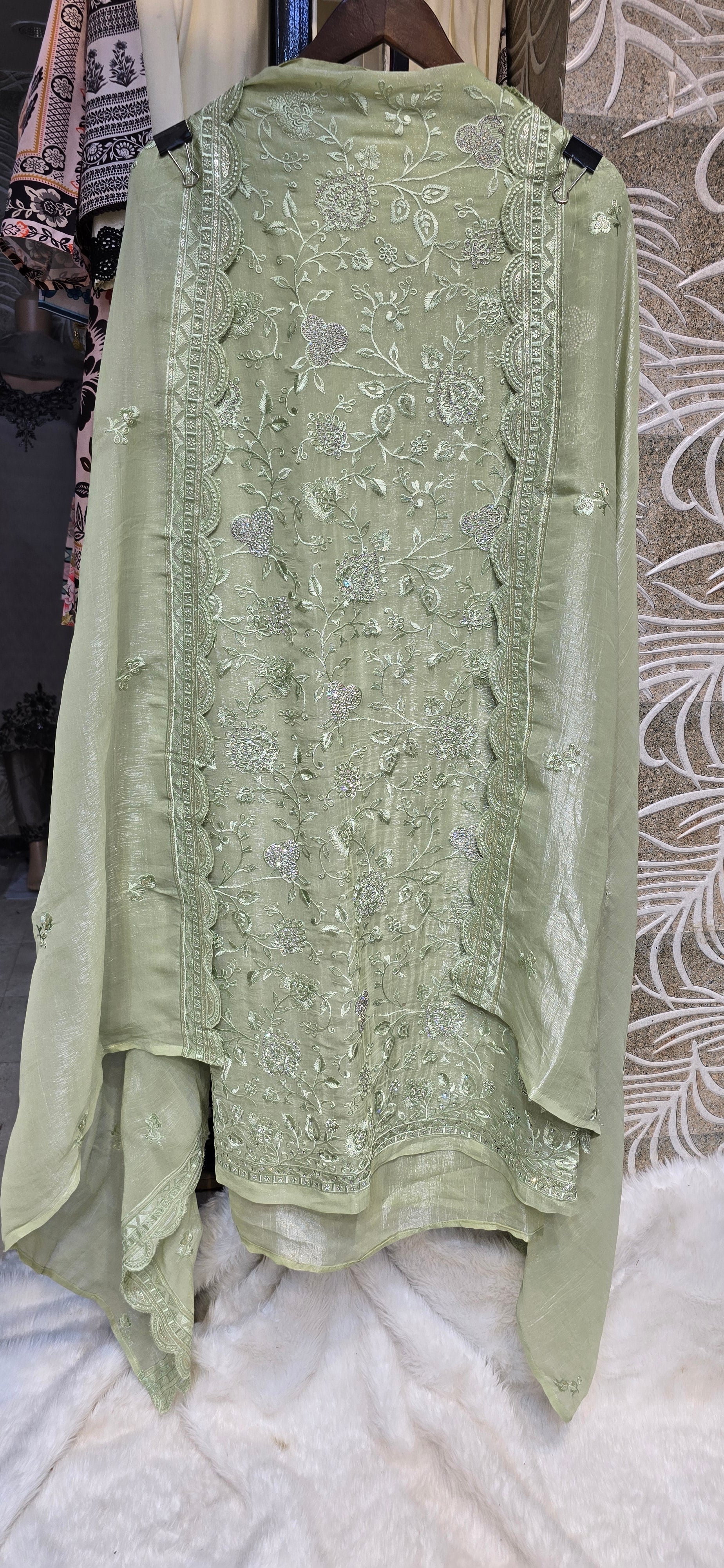 Celebrate tradition with this exclusive 3-piece Mehendi set in a vibrant green shade, expertly crafted with full embroidery. Designed for special occasions, the dress combines intricate detailing with comfortable fabric, ensuring you look elegant while staying at ease throughout your festivities. The set includes a matching dupatta and bottoms, completing your ensemble for a graceful and memorable appearance. Perfect for those who appreciate craftsmanship and classic style in their celebratory attire.
