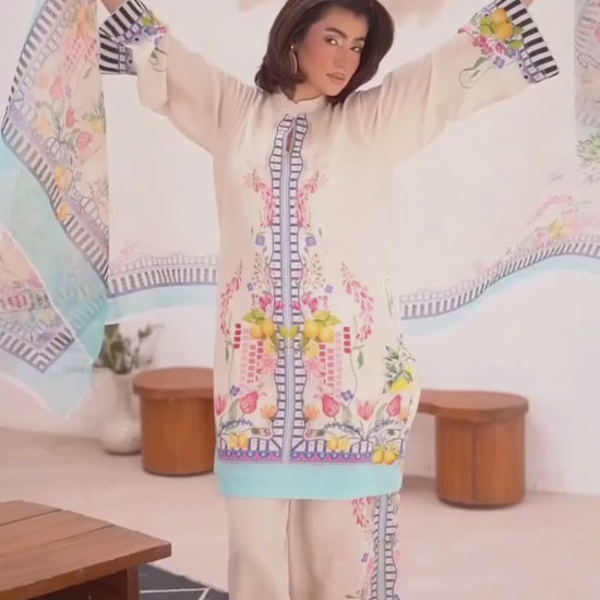 Elevate your ethnic wardrobe with this exquisite three-piece Pakistani ensemble from Aminah Designs. Featuring an off-white base adorned with delicate floral prints, this set comprises a beautifully tailored kurta, coordinating bottom, and flowing dupatta. The timeless color palette and intricate botanical motifs offer versatility for both festive occasions and everyday wear. Crafted with attention to traditional design elements, this collection piece celebrates classic South Asian aesthetics while maintaining contemporary appeal. Perfect for those seeking refined elegance with cultural authenticity.