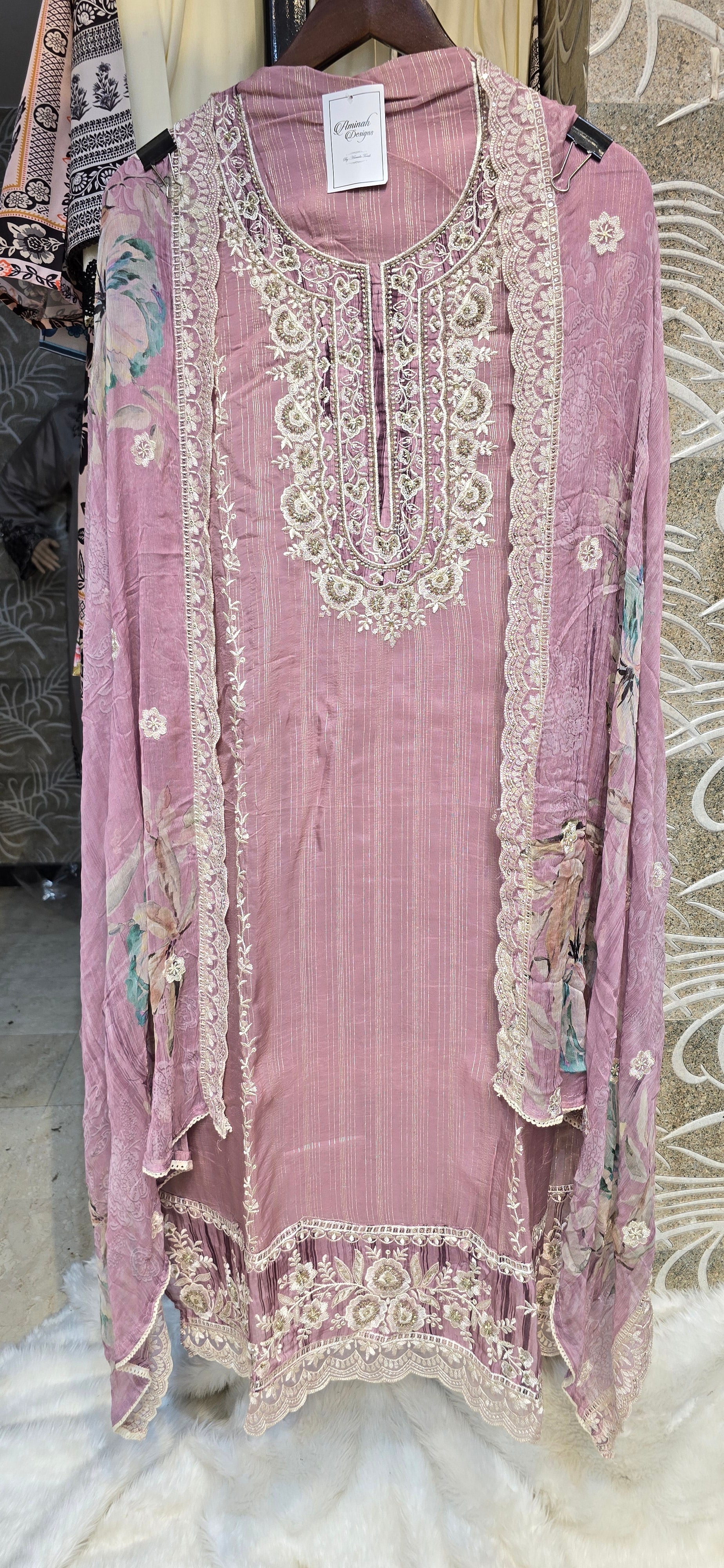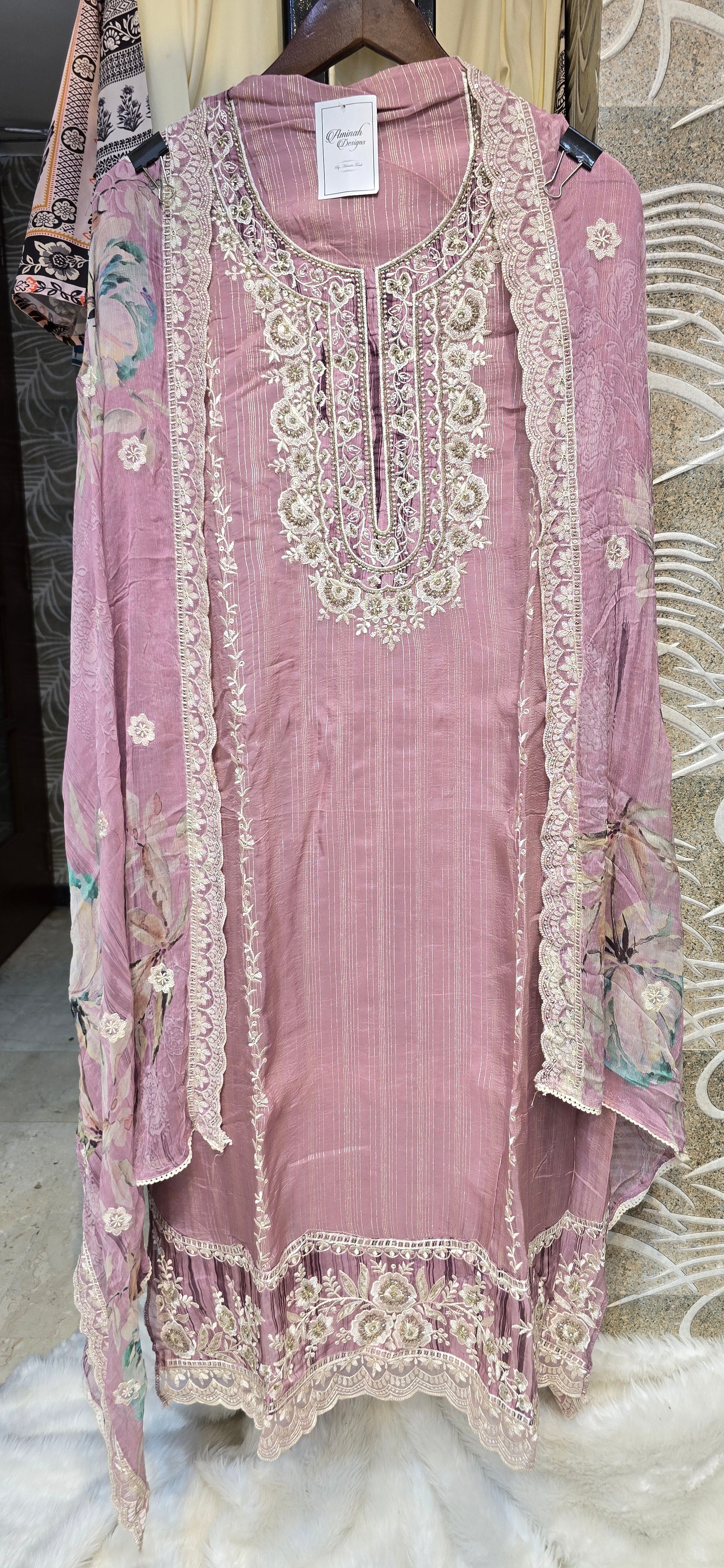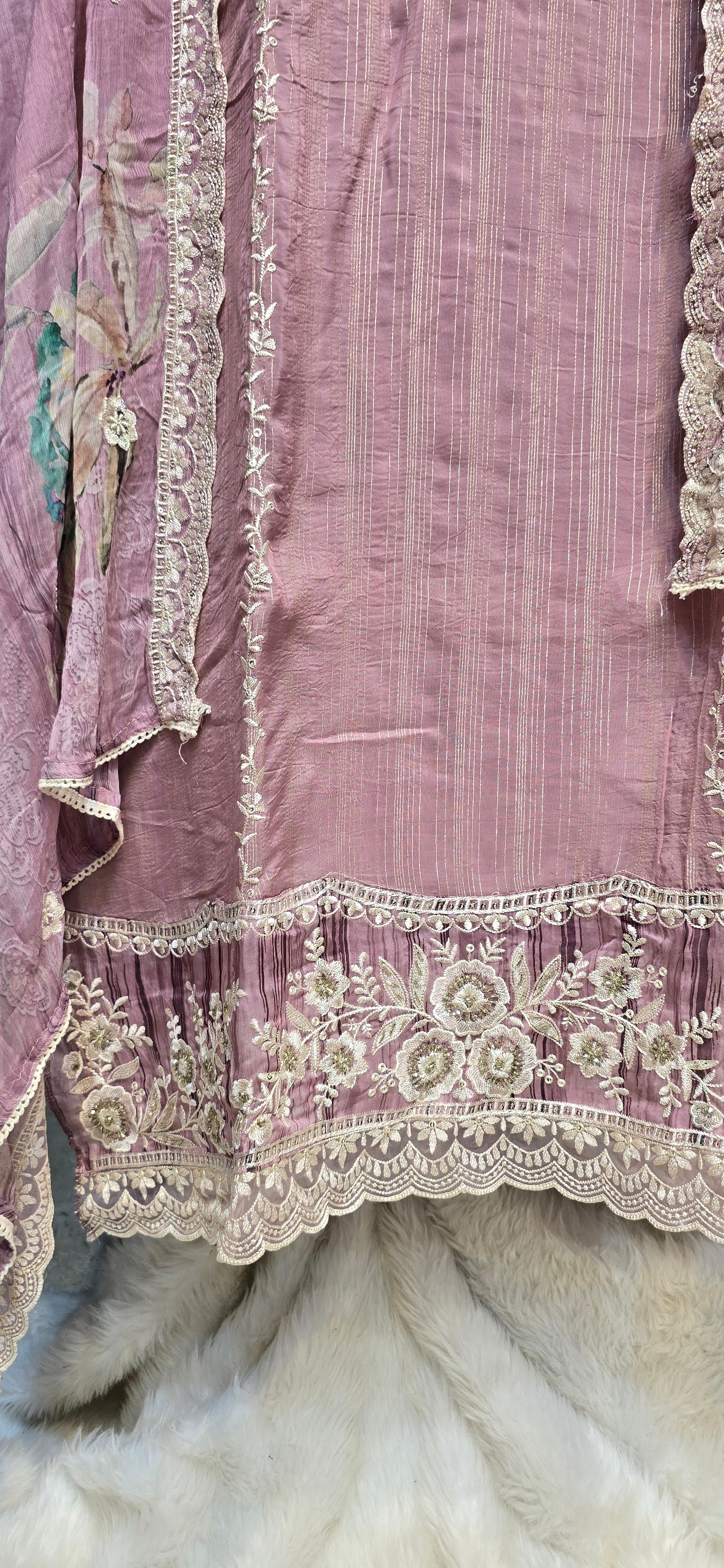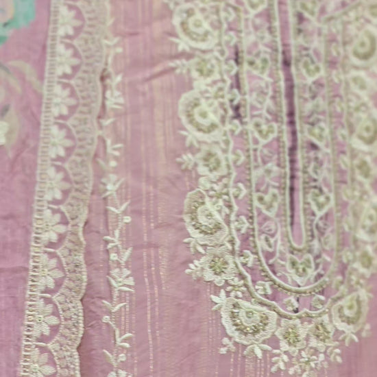 Experience elegance with this Pink 3-piece semi-stitched dress featuring intricate heavy embroidery on the top and dupatta. Crafted for a tailored fit, it offers versatility and a refined look suitable for special occasions. The rich embroidery adds a touch of sophistication, making it a standout choice for your wardrobe.