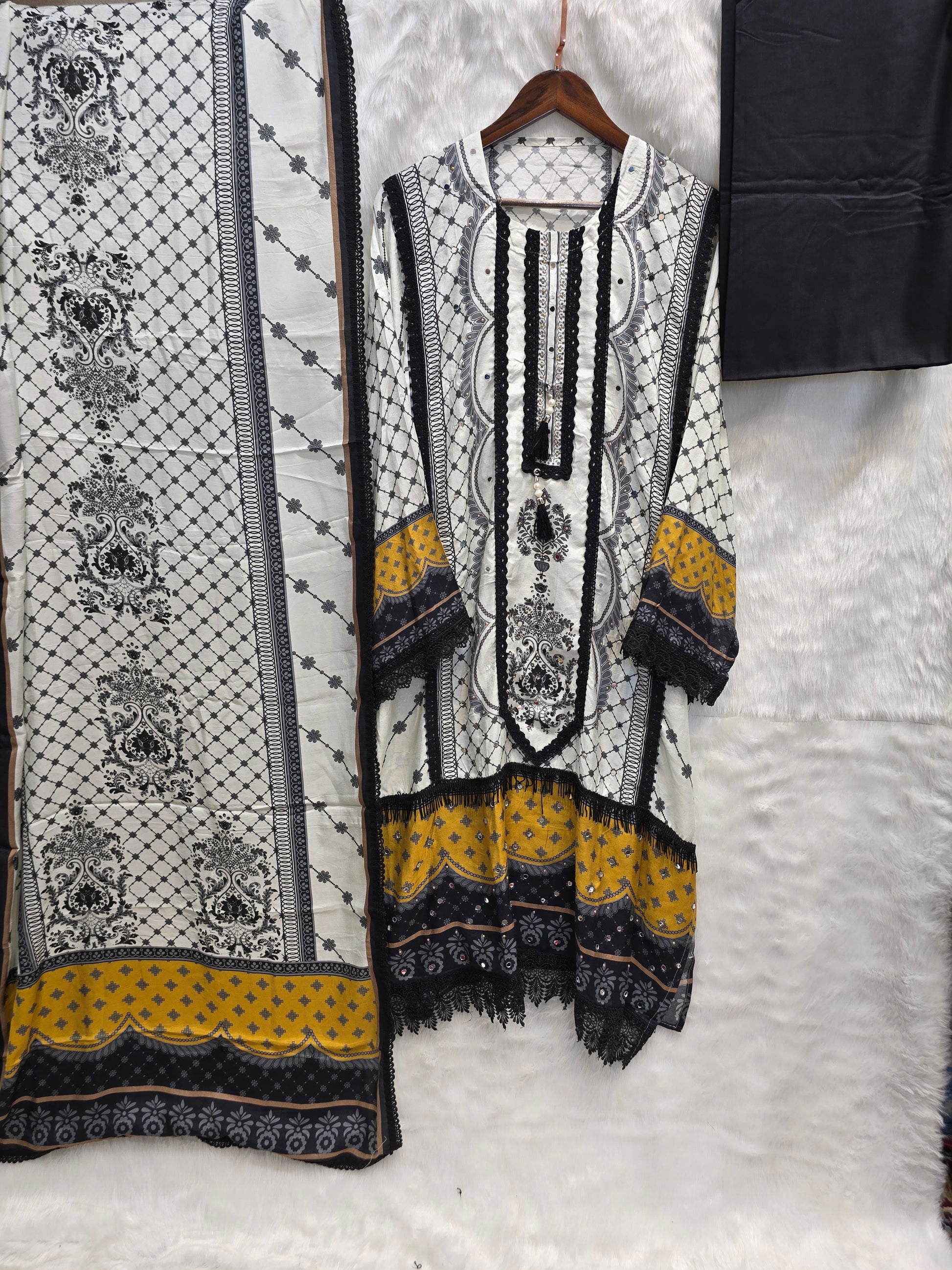 PURE MUZLIN 3 PC SET SEMI STITCHED WHITE AND BLACK WITH BEAUTIFUL LACE WORK AND MIRROR WORK