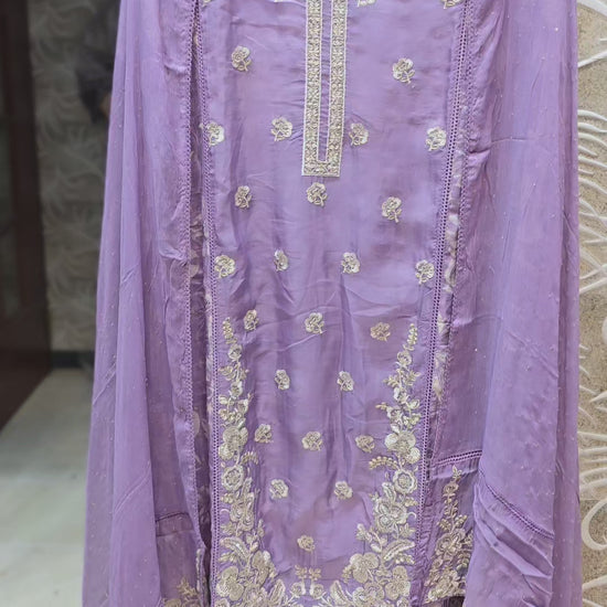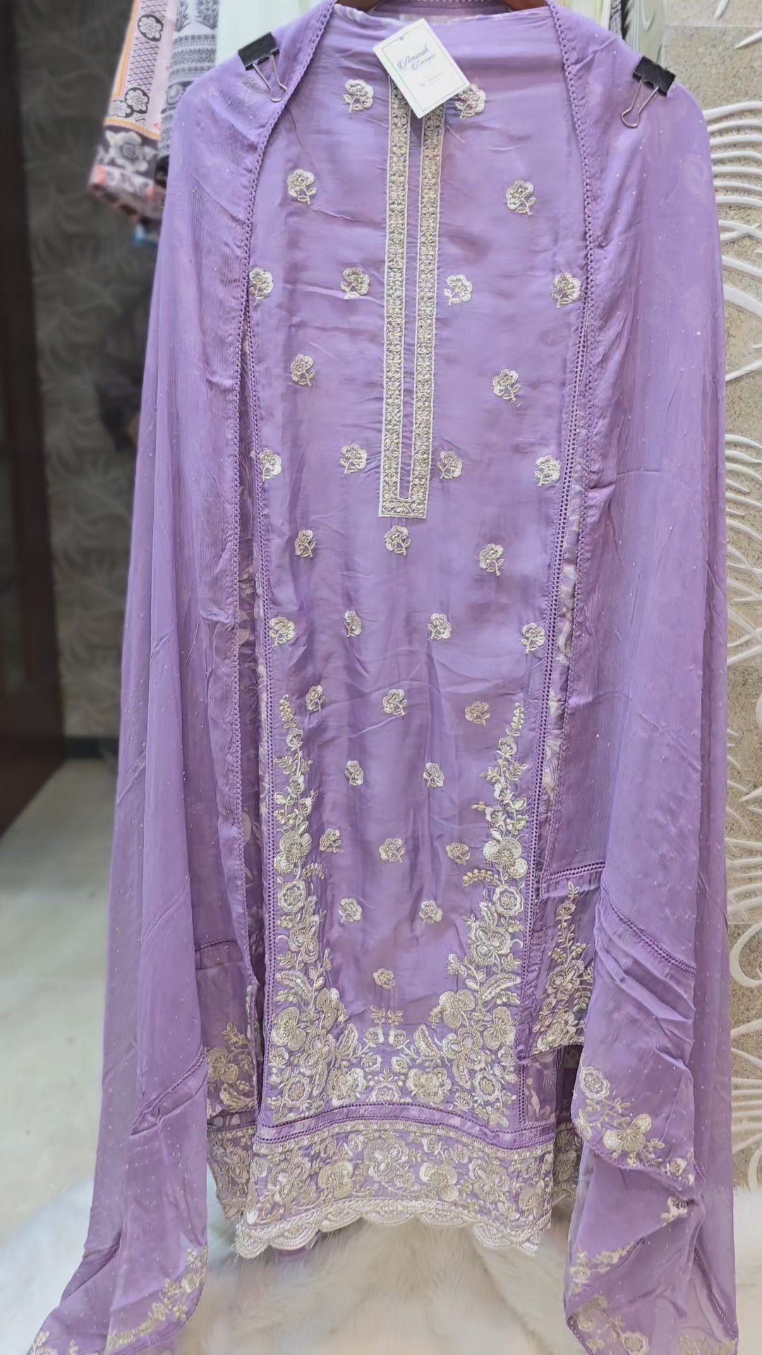 This purple embroidered 3-piece unstitched set offers the flexibility to customize your outfit perfectly. Crafted with intricate embroidery, the set includes fabric for a top, bottom, and a matching dupatta, allowing you to create an elegant ensemble tailored to your style and fit. Ideal for those seeking both sophistication and personalization in their wardrobe.
